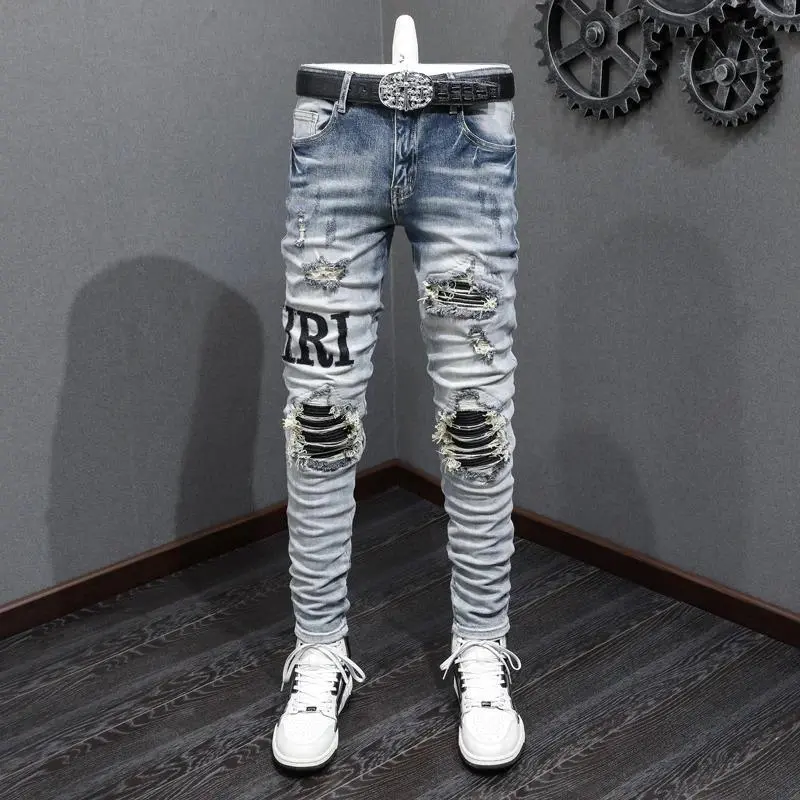 Be the first to review “[]Designer High Street Fashion Men’s Blue Jeans Stretch Tight Washed Letter Jeans Patchwork Hip Hop Style Embroidered Pants(Raincoats)”