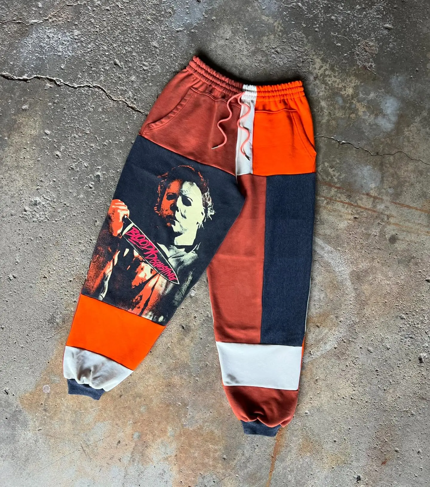 Halloween jogger pants in vintage patchwork design, sustainable streetwear for matching urban lovers..
