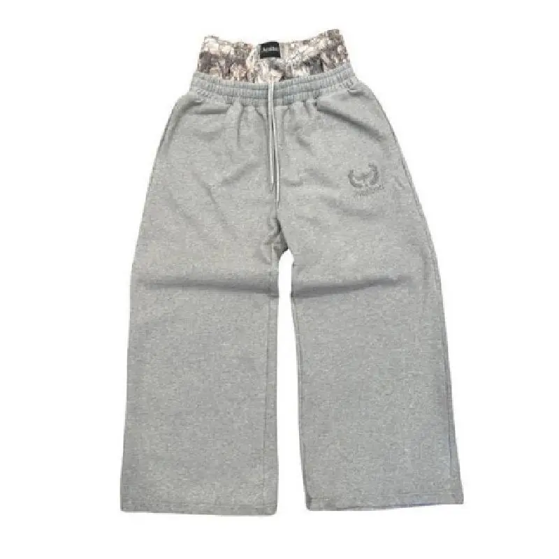 Unisex Embroidered Streetwear Sweatpants Lace Up Double Waist Hip Hop Baggy Casual Straight Leg Grey Sports Pants
